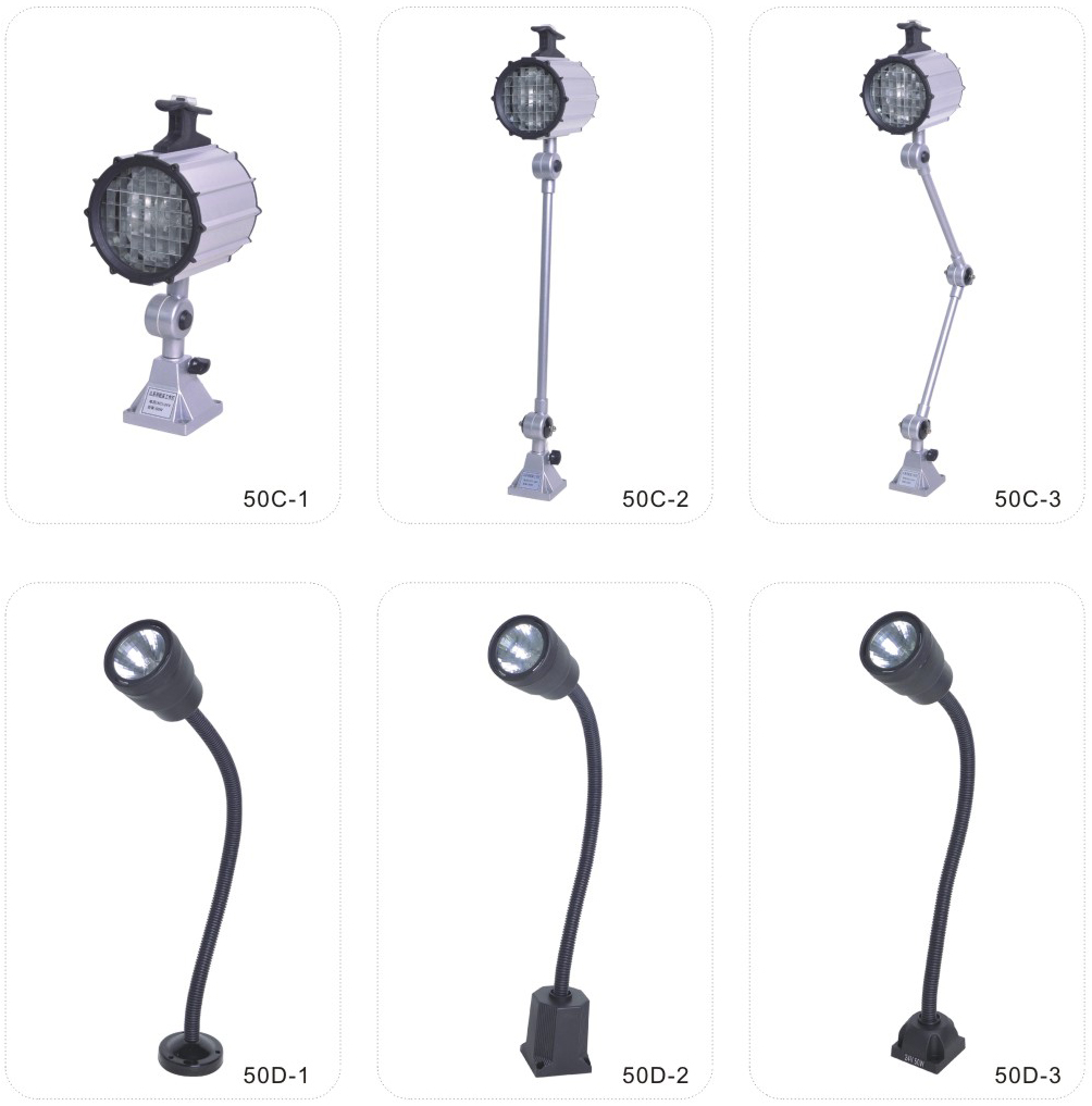 JS.109003 50C??50D series work light 50 C working lamp adopt halogen tungsten lamp of new light source, the light is downy, concentrated sex good, suitable for all kinds of large and medium-sized machine tools, CNC machine tools, machining centers and lighting of ordinary machine tool, and has the advantages of waterproof, explosion-proof, prevent erosion. 50 D is suitable for small and medium sized machine tools, medical equipment and automotive repair, ship repair, lighting equipment maintenance work. Different can be built in electronic transformer, the input voltage.